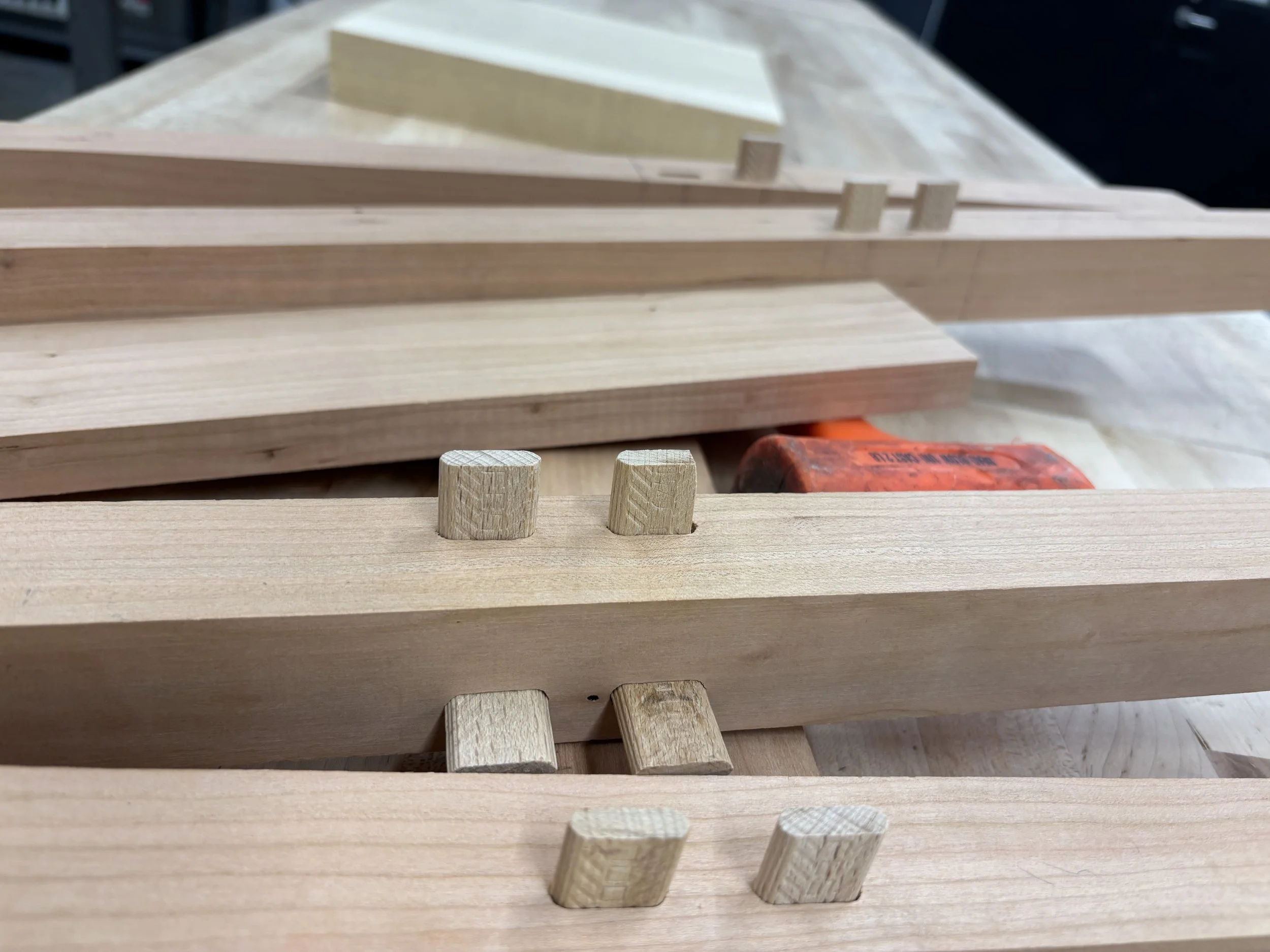 When ripping my parts I used dominios for play to dryfit everything together to ensure my measurements were correct. I then begin sanding parts of my bench. I seperated them into sections while gluing to ensure I could cover all surfaces.