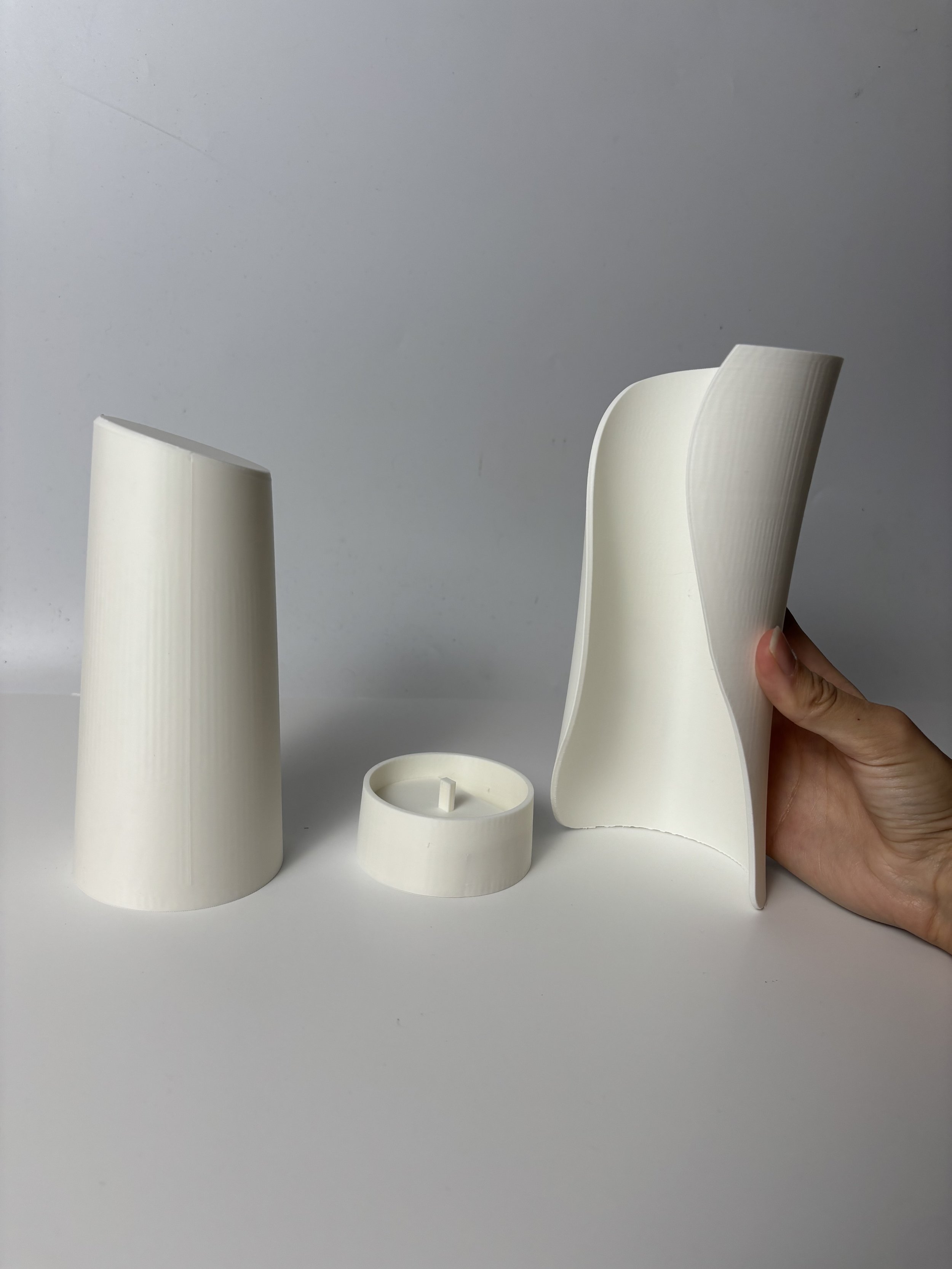 The most important thing while 3D printing the first couple rounds was to consider space for the internals and this negative space that I chose to move forward with to really stretch the aesthetic of modernism and futurism. Many of the inspirations I discovered had negative spaces for light to seep into.
