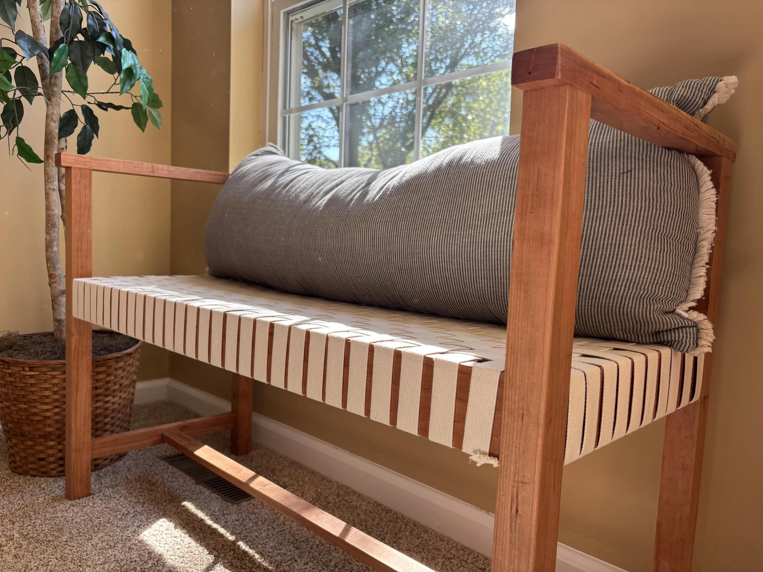 Design Goals | My main goals were to create a simple piece of furniture that was structurally sound and could bear the weight of two people. I decided to pick a woven bench to add interest to the seating area, along with armrests on either side to allow for user comfort.