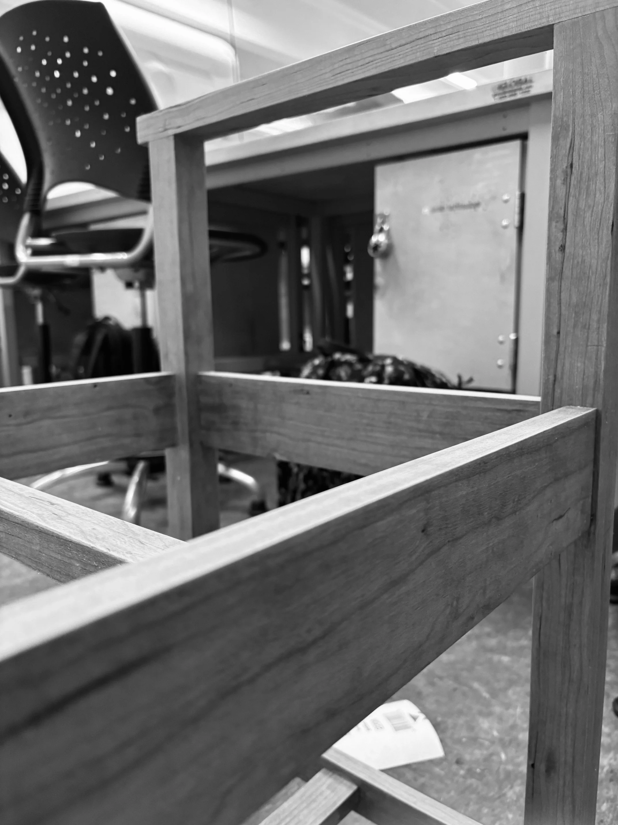 During the building process, I milled, planed, sanded, joined, dominoed, and glued my wood. I had 2 armrests, 4 identical legs, 4 aprons, and a support beam running through the bottom middle to ensure the legs didn’t cave on each other. Assembling was the most fun part!